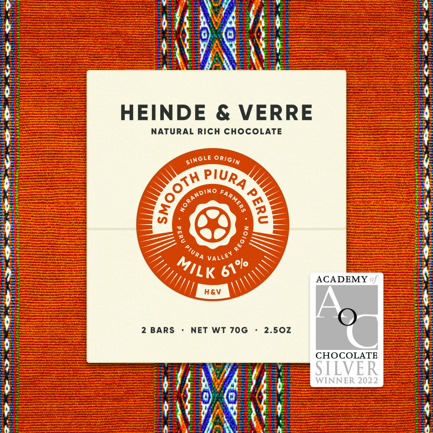 Ganz neu in diesem Jahr auf den Markt gebracht hat Heinde & Verre diese dunkle Milchschokolade aus seltenem Piura Kakao aus Peru. Gleich zum Start erhielt sie eine Silber Auszeichnung der Academy of Chocolate: Smooth Piura Peru Milk 61%