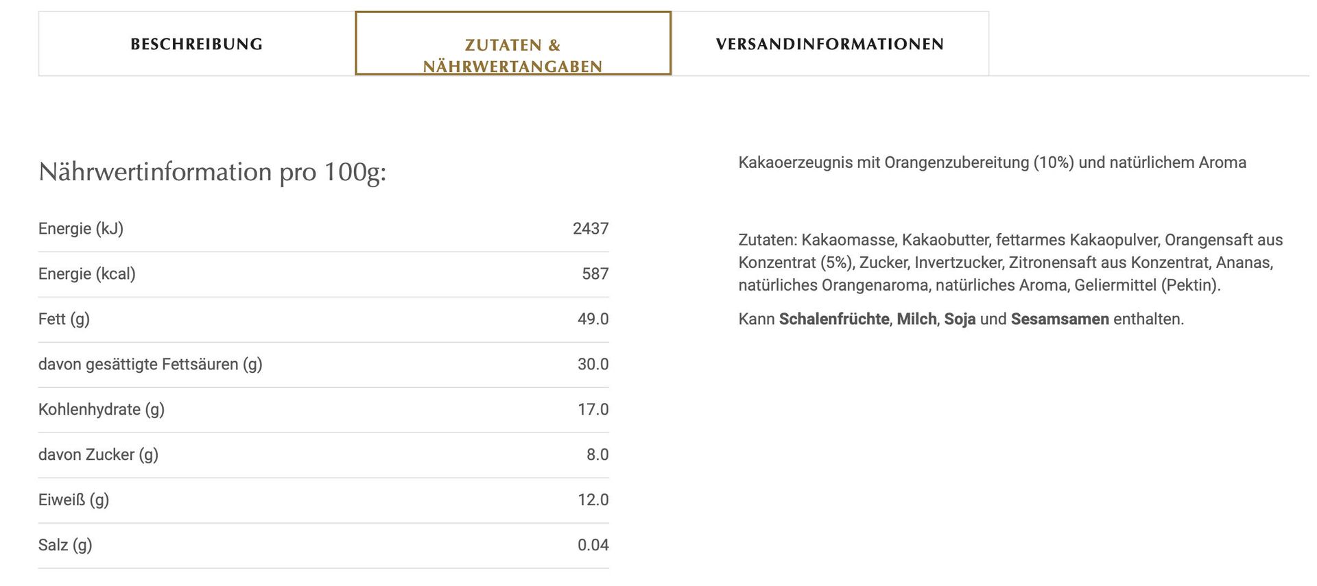 Damit widerspricht sich Lindt selbst, denn die Zutatenliste enthält ganz klar „Zucker“ als Zutat. Der in den Nährwertinformationen genannte Zucker kann also nicht ausschließlich der natürliche Zucker aus Kakao und Orange sein. Dabei ist es als Einordnung als „Schokolade“ auch vollkommen unerheblich wie viel Zucker zugegeben wurde. Zum Abschluss noch ein Screenshot von der Lindt Webseite (lindt.de) mit der Zutatenliste und noch ein Hinweis an das Marketingteam von Lindt: „Orangestückchen“ und eine „Orangenzubereitung“ wie ihr sie herstellt sind nicht dasselbe.
