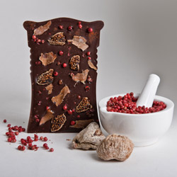 Kiki's Herkunftsschokolade aus feinem Grenada Kakao mit Schinken, Feigen und Rosa Pfeffer. 85g Tafel
