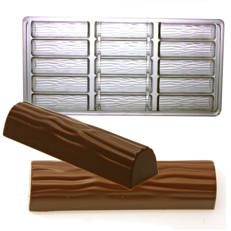 Eine Profi Schokoladenform für Riegel in Baumstamm-Form. Auf der Form sind 15 Baumstämme. Die Form hat die Standardmaße 135 mm mal 275 mm.