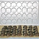 Pralinenform für glatte Kieselsteine. Bei Verwendung von zwei Formen können Kiesel mit 39 mm Länge, 34 mm Breite, 14 mm Höhe und 11 Gramm Gewicht hergestellt werden. Stabile, langlebige Polycarbonatform.