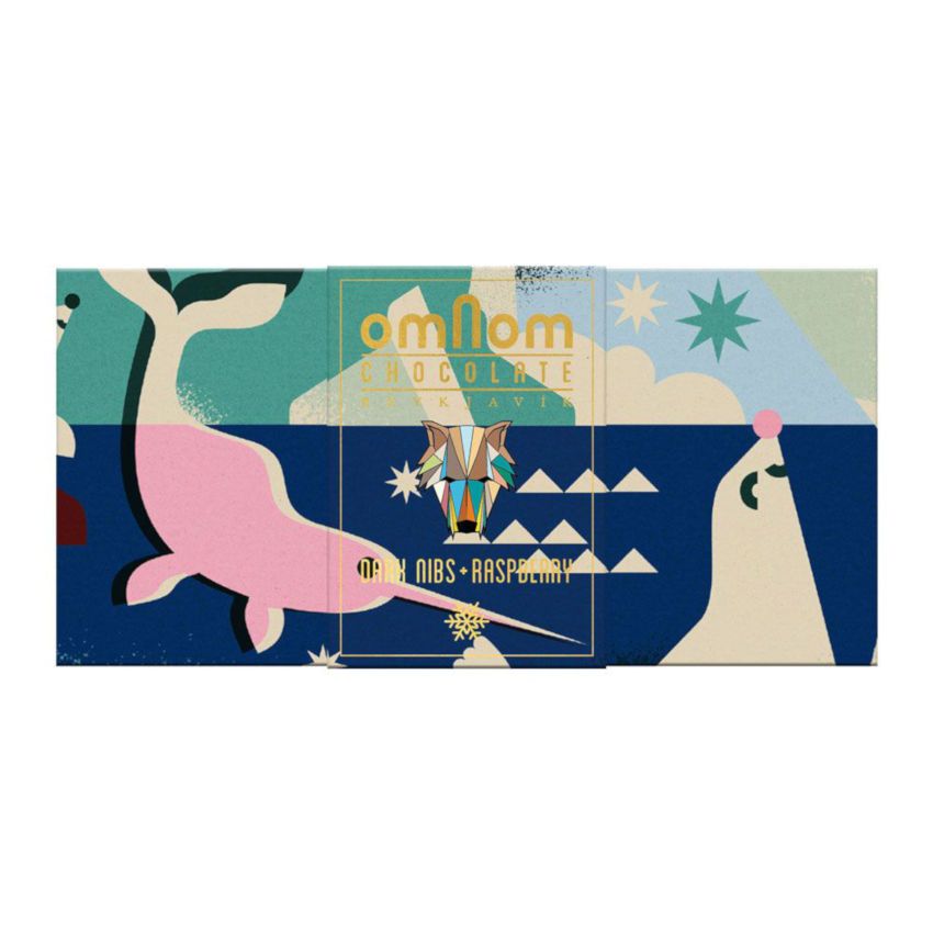 Dunkle Bean to Bar Schokolade mit Kakaonibs und Himbeer-Crispies aus der Winteredition von omNom aus Island. 60 g Tafel.