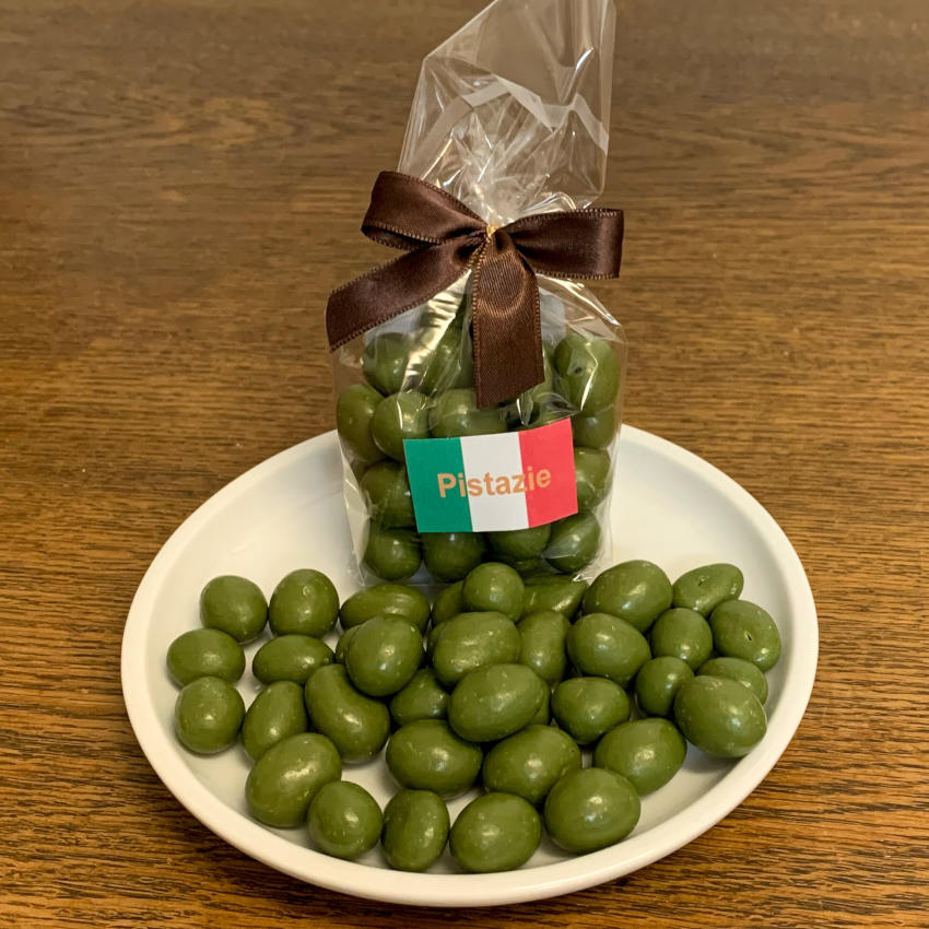 Feine Dragées mit einem Kern aus Pistazien-Praliné umhüllt von Dunkler- und Weißer Schokolade. Von Noalya aus Italien. 100g Beutel.