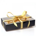 Pralinenschachtel für 8 bis 12 Pralinen mit Klarsichtschuber. Schachtelfarbe: Schwarz. Innenfarbe: Gold. Für zwei Reihen Pralinen. Die beiden Reihen werden durch Goldkarton getrennt. Die Faltschachtel wird nicht aufgestellt geliefert. OHNE Deko und Schleife.