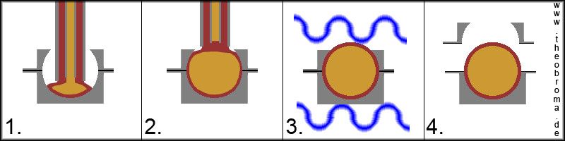 - Während die Form gefüllt wird bewegt sich der Füllkopf nach oben aus der Form heraus. Damit die Trüffelkugel geschlossen wird, läuft die Schokolade kurze Zeit länger als die Füllmasse. (Danach kann die Form kurz vibriert werden, um Luftblasen zu beseitigen.)